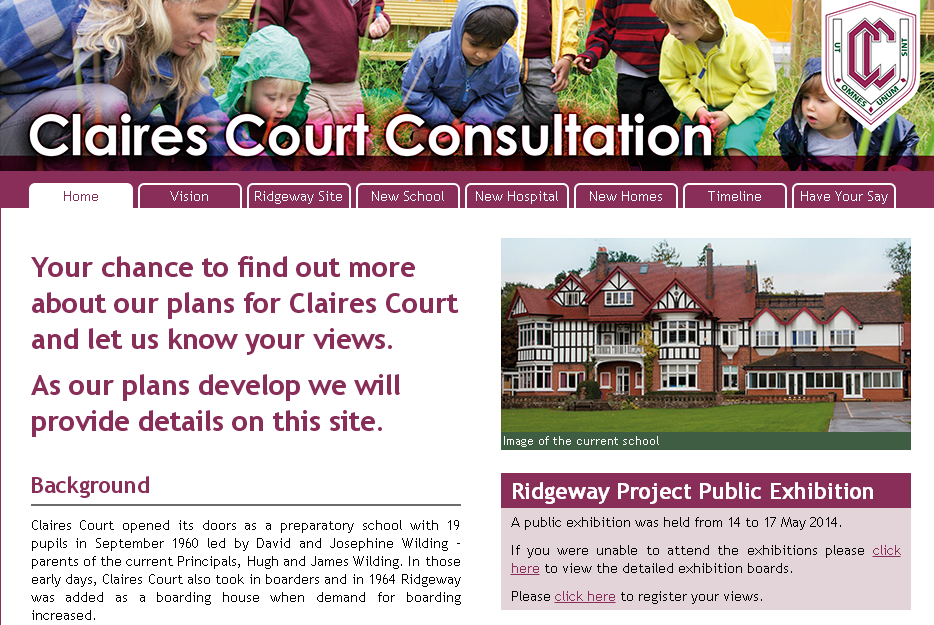 We are midst stream with our plans for a new school campus at Claires Court Junior Boys. We have partners in our work, including our architects PRP, our project managers Synergy, and our current site investors Berkeley homes. IMSB have proposed a hospital development on some 8 acres of our land at Maidenhead Thicket, and if fulfilled will provide valuable financial help for our new school. At the time of writing, a local gossip site quotes a variety of opinions which suggest that we have failed planning permission and/or that the Hospital have pulled out.