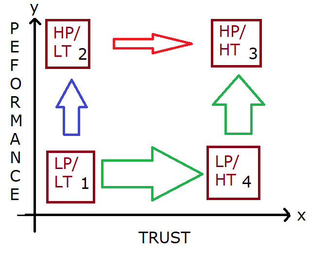 I guess we can all see that the individual we would wish in our team is Box 3, the High Performing / High Trust individual, and the one we want on our side is Box 1. What’s interesting is that the Box 2 person will always be disliked, whereas the Box 4 person not only can make a good contribution to the team, but can be coached and developed into the great team player you are looking for. Sinek’s experience (and mine it must be said) is that you can’t ever coach trustworthiness into a fully formed adult – inherently and repeatedly they will always let you down. The coloured arrows indicate what’s possible, the red indicating NOT. You can watch a short clip of Sinek’s ideas here – https://www.youtube.com/watch?v=YPDmNaEG8v4