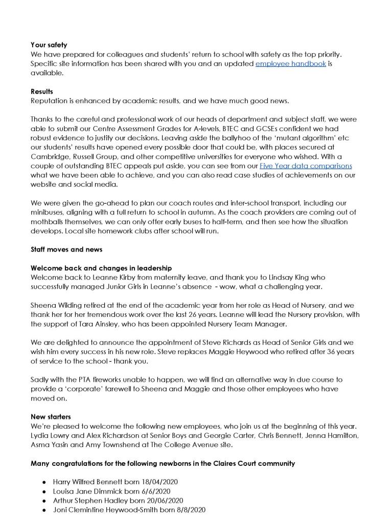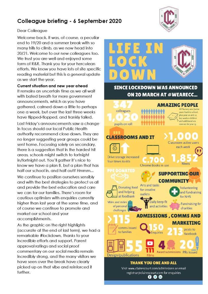 Just a quick note to thank all of my hardworking colleagues at Claires Court for the incredible week or so of heavy lifting all have engaged in across the 3 sites and additional sports/outdoor education venues. Nothing is normal about our new way of working, and from the most senior employee downwards, we all have to unlearn the routines embedded in our ‘professional’ muscle memory for the physical way we work in class. New rooms, new spaces, secure bubbles and the rest have to be learned anew, with every action and reaction taking twice as long, as we check again that we keep our colleagues, students and children safe. For their part, on almost all faces returning to school, nerves and joy – for a very few, unfettered joy, as if the caged animal has been released from the chains that were binding its ‘childhood’ freedoms. You can see here the Wilding brothers’ briefing to staff – it’s been an incredibly impressive 5 months and more – #WEARECLAIRESCOURT.