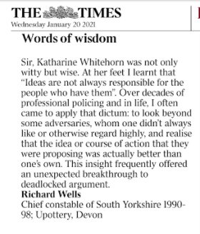 Richard Wells, former Chief Constable of South Yorkshire wrote to the Times this week, in order to pay tribute to this less well known quote of the recently deceased journalist, author and broadcaster, Katharine Whitehorn. He explains how over a career of professional policing, understanding that solutions for dispute resolution might arise from the most unlikely quarters, and that’s a view with which I wholeheartedly concur.