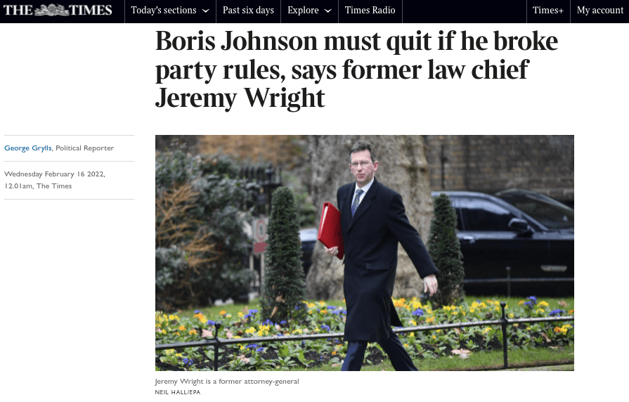 The problems the Prime Minister has seem rather more than whether he has committed a crime in the eyes of the Law, as a consequence of the findings of ‘Party Gate’, the reports of multiple occasions of drinks events and birthday parties at 10 Downing Street from Summer 2020 to Christmas 2021, all of which seem pretty damning, it must be said. Boris Johnson’s far bigger problem is that the Prime Minister may have lied to Parliament, and if that is the case, he’ll have no choice, as suggested by his deputy Dominic Raab and so many others in his own party last month, and reiterated today in the Times by a formed Conservative attorney-general, Jeremy Wright, MP for Kenilworth.
