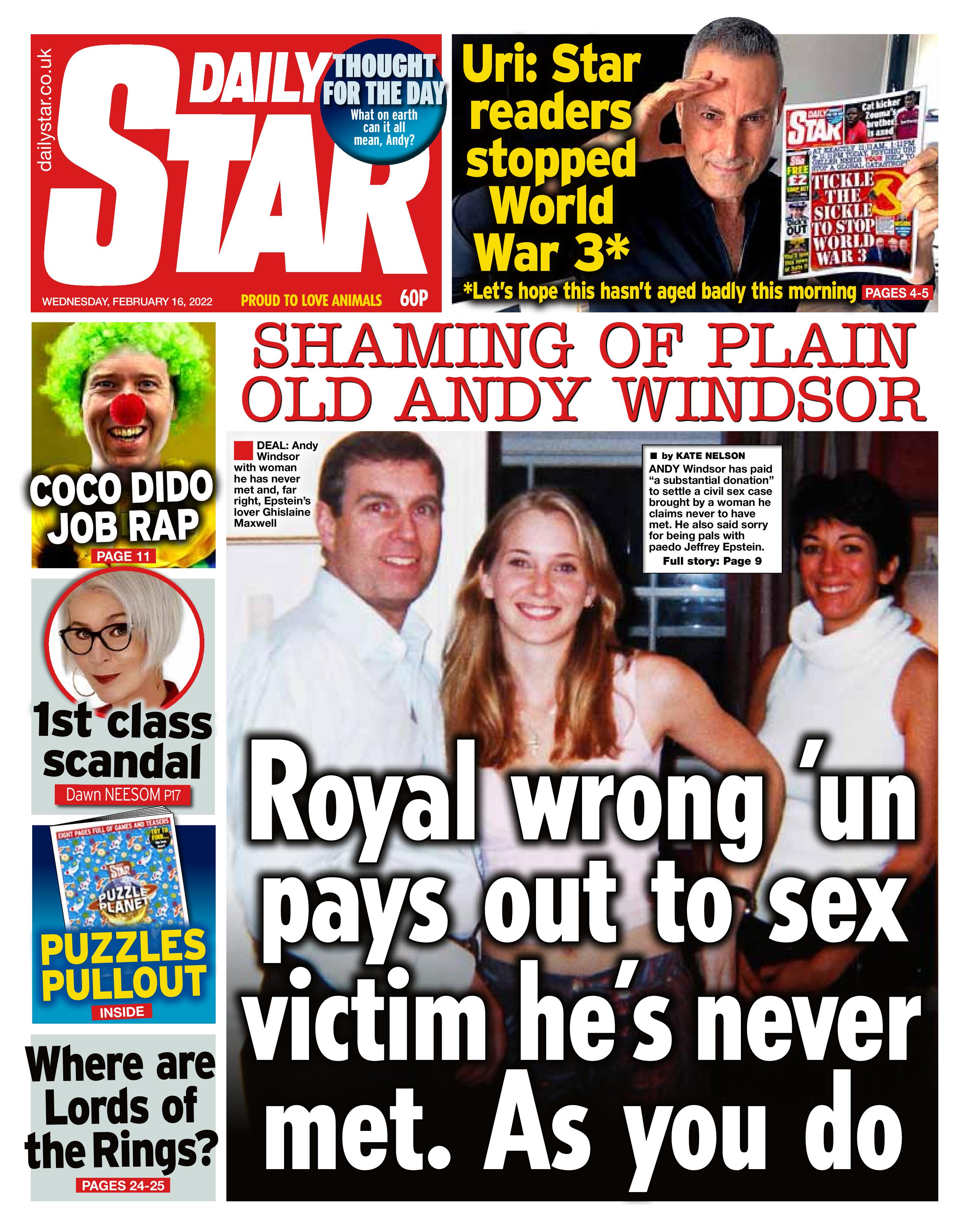 In February 2022, we see a perfect storm, in which the Prime Minister of the Day is being investigated by the Metropolitan Police, whose Commissioner herself has resigned because others have no confidence in her propriety and when the second son of our Monarch has chosen to buy off a ‘sex claim victim’. On the latter, whilst I rarely applaud the Daily Star, today’s front page has it so right: