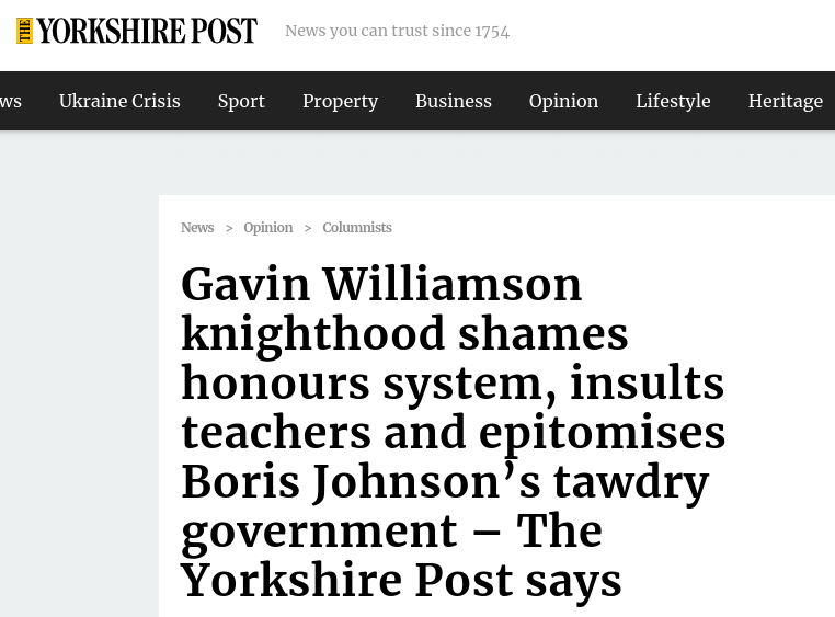 Since the election of the current administration, we find ourselves in the hands of politicians, of whom some are are at least economical with the truth and at worse just bare faced liars who have betrayed the trust the electorate have placed in them. Whilst these opinions are personal to me as an adult member of our democracy, I hope I do not overstep the mark when as a headteacher and I certainly don’t plan anytime soon to call out individuals in parliament as part of my school duties. I won’t though be the only headteacher appalled to learn this morning that the last Secretary of State for Education, Gavin Williamson has been knighted with immediate effect. The simple statement from Prime Minister’s Office, 10 Downing Street could not be simpler: “Knighthood. The Queen has been pleased to approve that the honour of Knighthood be conferred upon The Rt. Hon. Gavin Williamson CBE MP“. I will leave it to the reader to make up their own minds about the suitability of such urgent appointments made with little relevance to the international emergencies of the day the country faces.