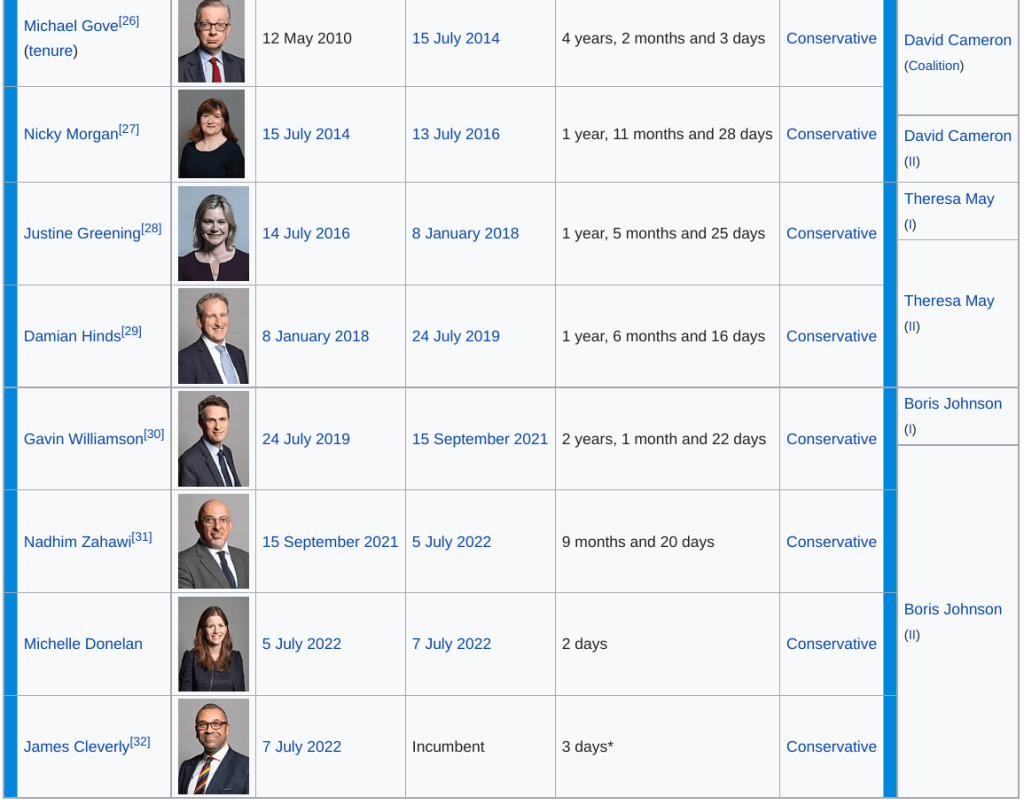 This old English proverb seems to have evolved over the centuries, and remains as fresh today as a millennia or more ago. English Education is looked after by its own ministry, the Department for Education, since it was recreated as such by David Cameron’s government in 2010 – the conservative appointments since are shown below.