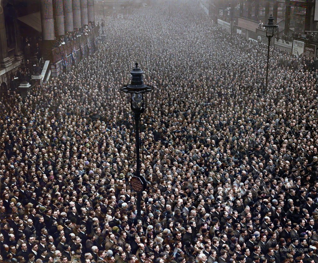 The photograph below was taken in 1918, at 11am 11 November, and from the hordes seen present, the country could not have been more ready to celebrate peace. The amateur artist who has colourised this image is BabelColour, @StuartHumphryes who posted this on Twitter.