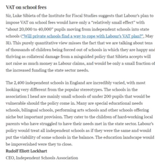 Below I copy verbatim the letter written to all ISC schools today, in which Julie Robinson, ISC CEO is quoted. As she makes clear, since the election our sector has been in overdrive working out how manage the genuine cost crisis the tax proposals will put on parents and schools.